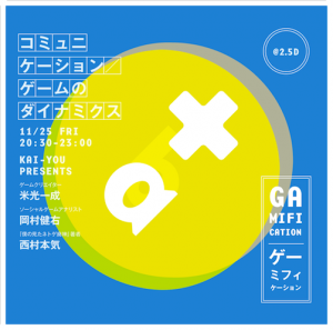 KAI-YOU presents「コミュニケーション/ゲームのダイナミクス」 ●日時:2011年11月25日(金)20:00~ ●場所:2.5Dスタジオ(池尻大橋) 詳細はコチラ 出演:米光一成(ゲームクリエイター)×岡村健右(ソーシャルゲームアナリスト)×西村本気(『僕の見たネトゲ廃神』著) 司会: 武田俊(KAI-YOU)内容:TALK料金:¥1,000(1D別)時間:OPEN 20:00 / START 20:30 米光一成 1964年生まれ。ゲームクリエイター/ライター。立命館大学映像学部教授。ゲームクリエイターとしての代表作に『BAROQUE』、『トレジャーハンターG』、『ぷよぷよ』などがある。現在はポータルサイト「exicite」や『POPEYE』、『WB』などで連載を担当。また2011年には「電書雑誌よねみつ」を立ち上げるなど、カルチャーやメディアの領域を中心に、幅広いジャンルで活動。 西村本気 1992年生まれ。中卒。自らも引きこもってMMORPGに没頭する「ネトゲ廃人」だった刊行当時17歳の著者による、迫真のルポルタージュ『僕の見たネトゲ廃神』(2010)刊行。全国書店行脚を成し遂げる。現在、その発行元のリーダーズノートで製作として勤務。