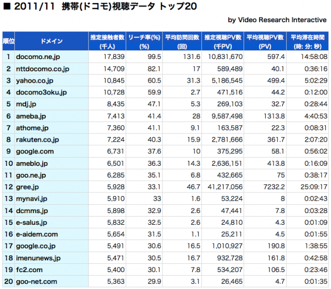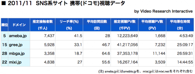 当記事では、ソーシャルメディアサイトの携帯ネット視聴率、2011年11月分をお届けしたい。