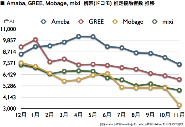まず、推定接触者数でみると、Amebaが10ヶ月連続でトップを維持し、GREE、mixi、Mobageと続いた。ただ、全体的にスマートフォン移行の影響で、明確なダウントレンドとなっている。例えば半年前と比較すると、Amebaが▲27%、GREEが▲20%、Mobageが▲47%、mixiが▲28%と、それぞれ減少が続いており、Mobageは11月に入って減少幅を大きくしている。