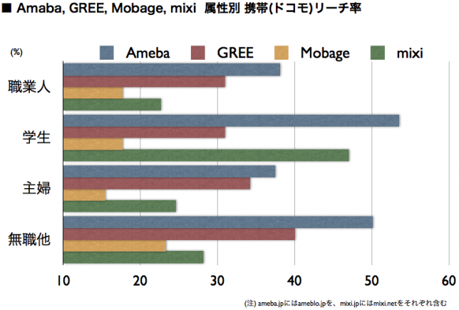 最後に、属性別の平均滞在時間を見てみよう。Mobage、GREEは職業人、無職他層の滞在時間が長く、mixiは逆に短い傾向が顕著に現れている。Amebaはリーチ率が低めの主婦層において、平均滞在時間の長さが突出しており、ヘビーユーザーが主婦層に多く存在していることが推測される。