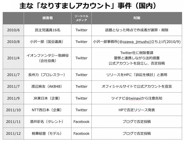 表に、最近1年半で話題になった、国内の「なりすまし」アカウント事件を表にしてみました。