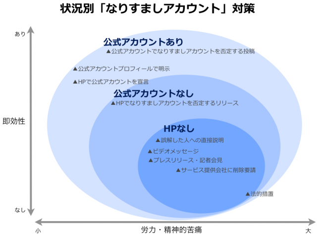 では、これらには、どのような対策が可能でしょうか?様々な状況で打てる施策を図にまとめてみました。図では、横軸を「労力・精神的苦痛」とし、縦軸を「即効性」として、それぞれの施策を私の主観でプロットしてみました。HP(ホームページ)がないよりはあったほうが、公式アカウントが無いよりはあったほうが、より労力が少なく、即効性の高い打ち手が多いことが判ります。