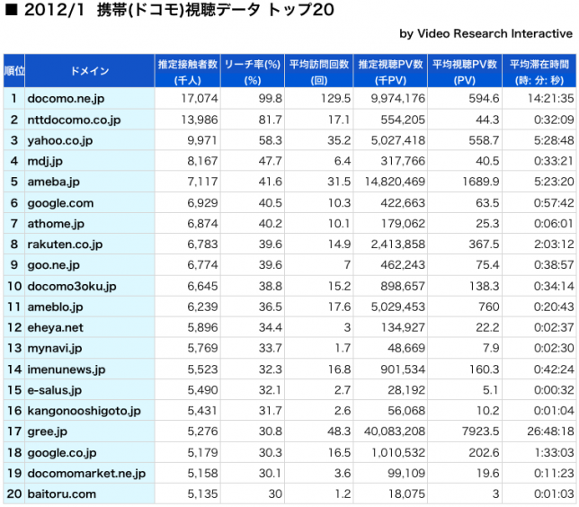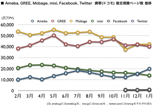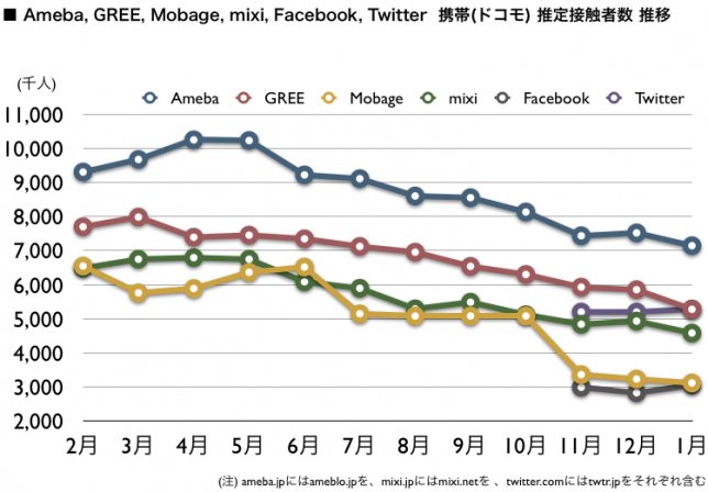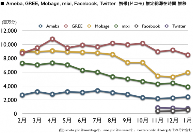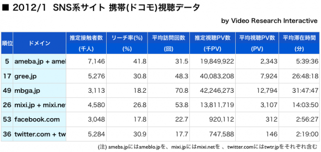 当記事では、ソーシャルメディアサイトの携帯ネット視聴率、2012年1月分をお届けしたい。