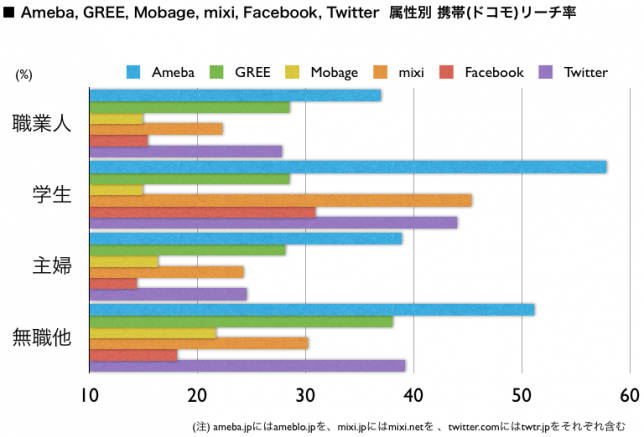 リーチ率では、全ての属性(職業人、学生、主婦、無職他)を通してAmebaがトップとなった。Amebaとmixi、GREEとMobage、FacebookとTwitterは、ユーザー層がほぼ同一傾向にあることも明確にわかる。全サービスを通じて、学生と無職他層の携帯コンテンツ利用率が高く、職業人や主婦は10-20%程度少ない傾向にある。