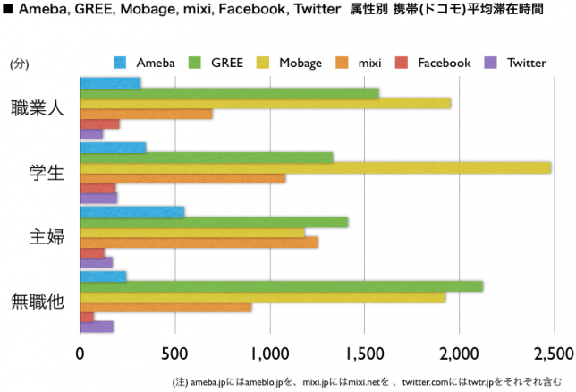 最後に、属性別の平均滞在時間を見てみよう。Mobage、GREEは職業人、無職他層の滞在時間が長く、mixiは逆に短い傾向が顕著に現れている。Mobageに関しては、12月に入ってから学生の滞在時間の増加が顕著に現れている。Amebaはリーチ率が低めの主婦層において、平均滞在時間の長さが突出しており、ヘビーユーザーが主婦層に多く存在していることが推測される。Facebook、Twitterは全ての層で滞在時間が短い傾向にある。