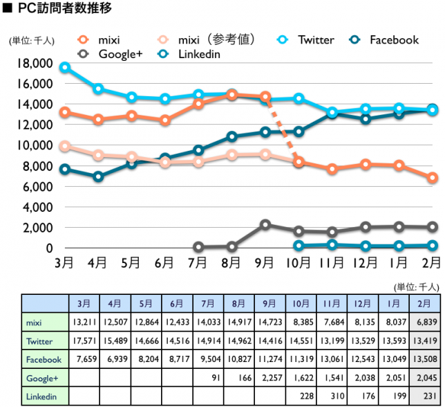 【ニールセン/ネットレイティングスのコメント】 ニールセン/ネットレイティングスは2011年10月データよりmixiの集計対象URLの変更をおこないました。これにより2011年10月以前と以降のデータの継続性は失われています。弊社ではデータ公表時点でのデータを公式データとしていますので、集計対象URLの変更を過去データに遡って反映させません。しかし、mixiの利用状況の把握に誤解が生じる可能性があるため、時系列利用動向グラフにのみ参考値として、2011年10月に集計対象から外したURLを含まない訪問者数を線形でのみご提示させて頂いております。