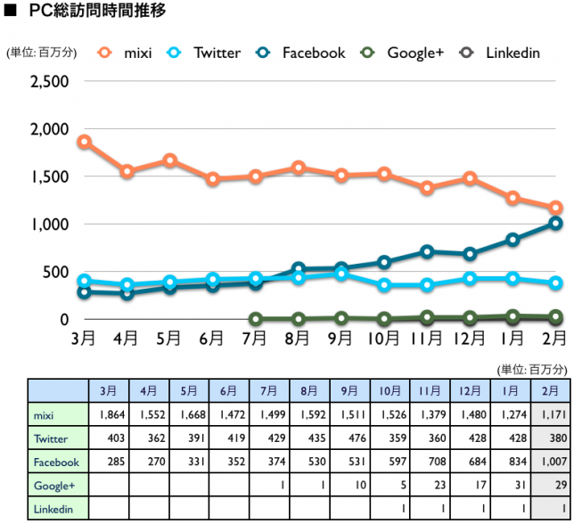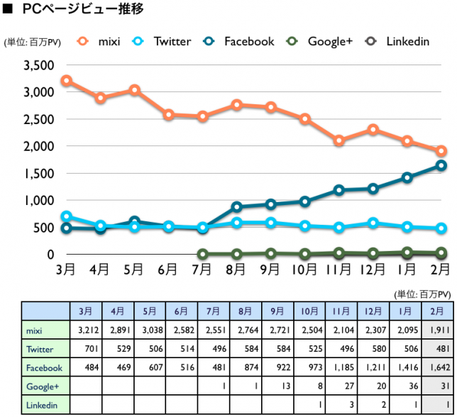 訪問者数を時系列で見ると、着実に訪問者を増加させてきたFacebookがわずかながらTwitterを抜きトップとなった。また下記のページビューや総訪問時間においてもFacebookの伸びは際立っており、訪問者数だけでなく利用者間交流が活性化している様子が伺える。それに対してTwitterとmixiはダウン傾向が続いており、明暗を分けるカタチとなった。