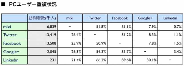 この表は、たとえばmixiユーザーの51.8%はTwitterを、51.1%はFacebookを、7.9%はGoogle+を0.7%はLinkedinを利用しているということを表している。Linkedinに関しては、9割弱のユーザーがFacebookも利用していることがわかる。