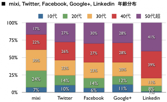 mixiは女性の割合が最も多く、年齢層が若い。一方でFacebookは男性の割合が多く、年齢層は40歳以上が6割弱となっている。Google+とLinkedinは現時点では男性ユーザーに偏りがあることがわかる。特にLinkedinは50代以上が最も多く、壮年期の男性が多いようだ。なお、mixiからはアクティブ会員の属性が発表(mixi 2011年度 第三四半期 決算説明資料 p18)されており、それと比較するとこのデータは男性比率が多く年齢層が高い。この差異は、mixi発表資料には携帯のみで利用しているユーザーが含まれているためと推測される。