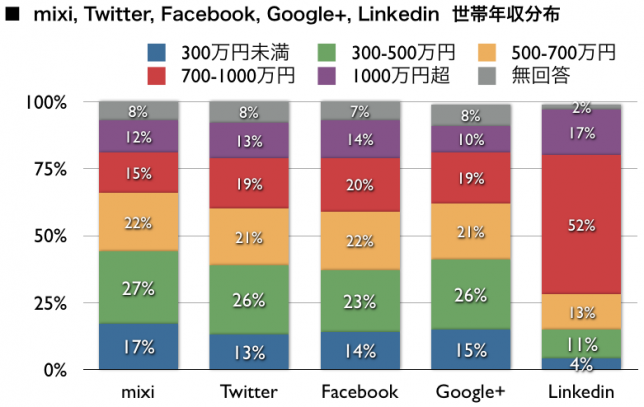 職業分布を見ると、mixiとGoogle+、TwitterとFacebookの構成比が近い。いずれのサービスも6割以上がビジネスパーソンとなっている。Linkedinは世帯年収で700万以上のユーザーが5割弱と、高所得者のビジネスパーソンが中心であるが、他の4サービスは世帯年収の構成比に大きな違いは見られない。